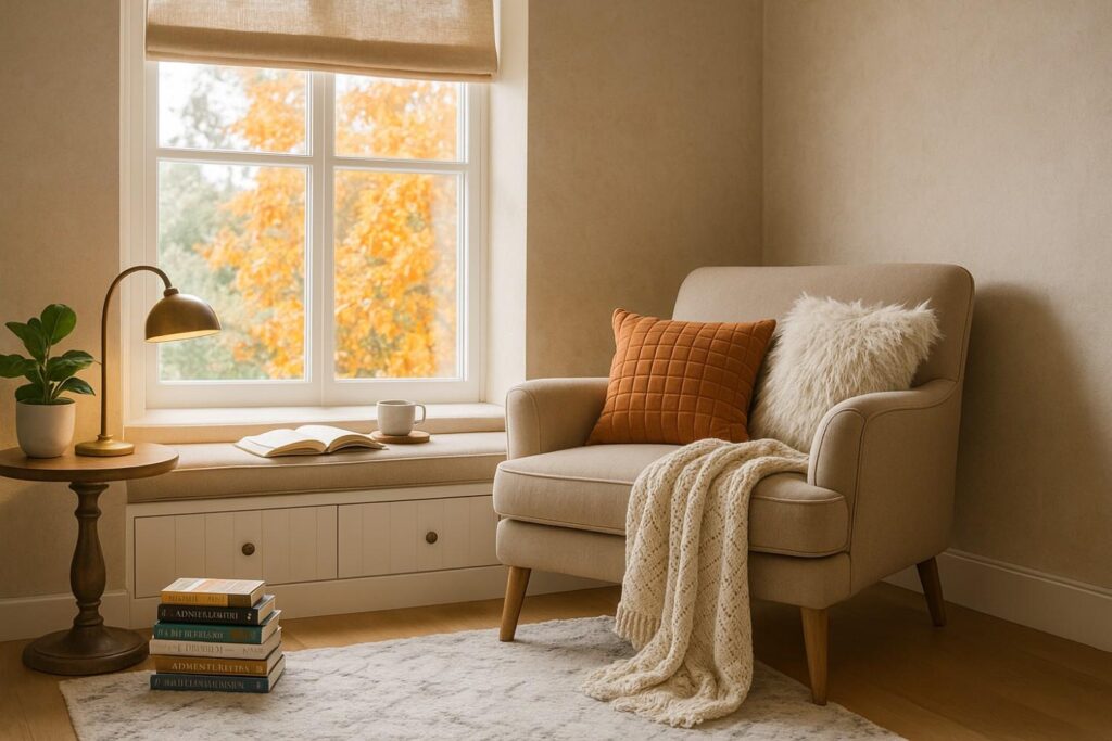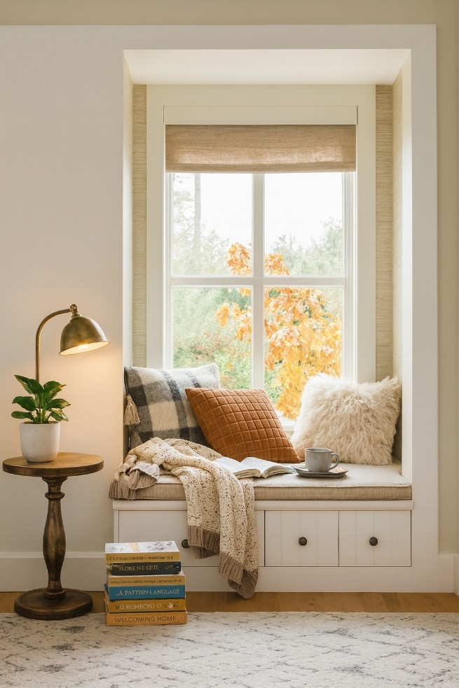 A cozy reading nook is all about touchable, warm textures. Even in the smallest area, layers create depth and softness.